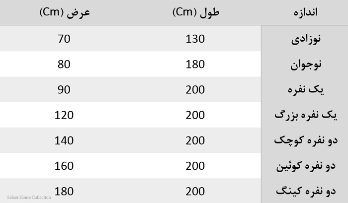 جدول سایزهای رایج تشک