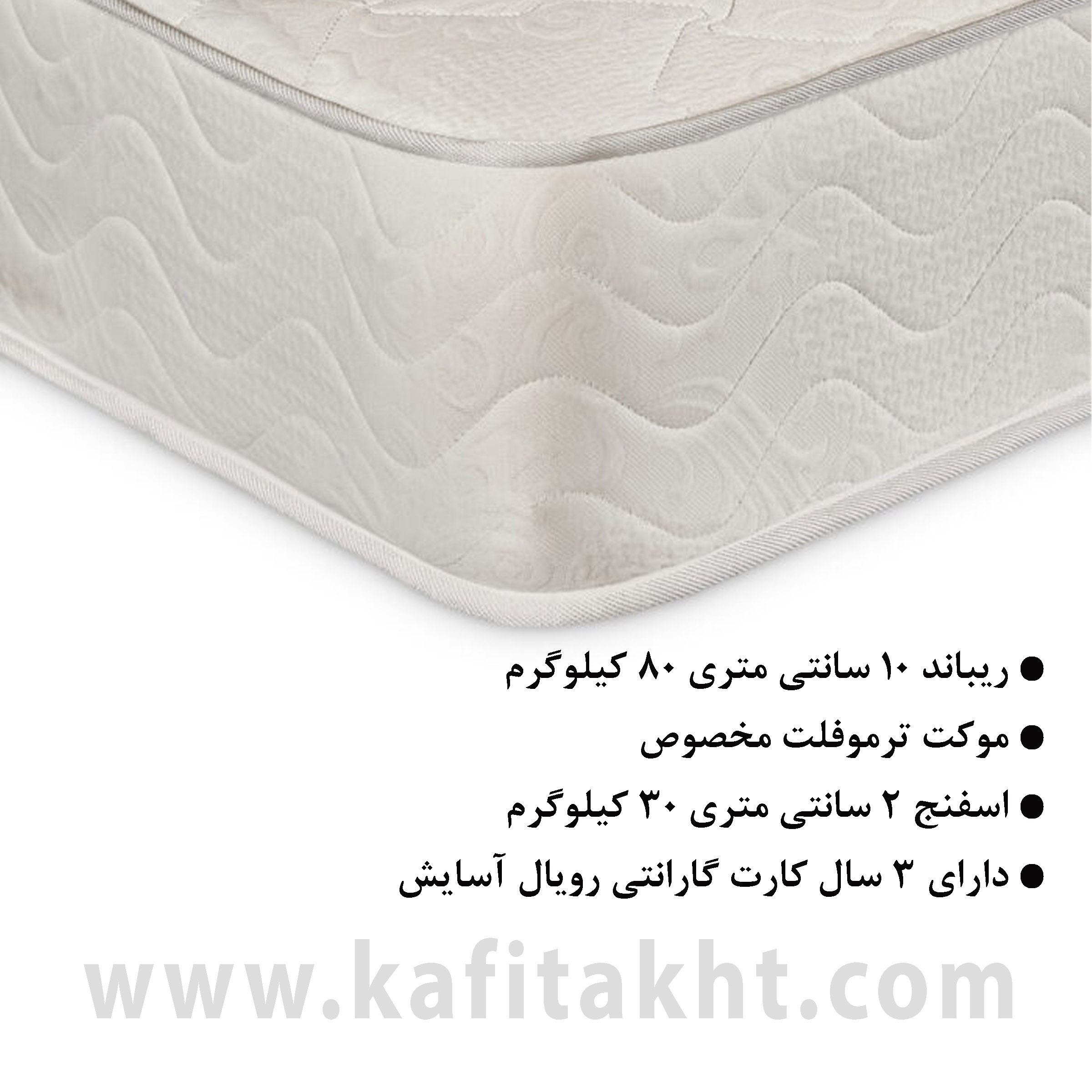 تشک طبی ویژه درنا از برند رویال آسایش با ساختار ریباند ۱۰ سانتیمتری با دانسیته ۸۰ کیلوگرم تولید شده است. در لایه داخلی آن از موکت ترموفلت مخصوص و اسفنج ۲ سانتیمتری با چگالی ۳۰ کیلوگرم استفاده شده تا دوام و پشتیبانی بالایی داشته باشد.